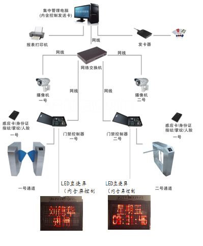 主要由計(jì)算機(jī)/打印機(jī)、智能讀卡器、智能控制器、攝像機(jī)、視頻服務(wù)器、智能閘機(jī)、智能卡及管理軟件等組成。采用TCP/IP網(wǎng)絡(luò)結(jié)構(gòu)通訊,通訊距離可無限擴(kuò)展,單臺(tái)計(jì)算機(jī)可接任意數(shù)量智能閘機(jī)。智能閘機(jī),既可聯(lián)網(wǎng)運(yùn)行,又可脫機(jī)運(yùn)行。系統(tǒng)組成圖如下: